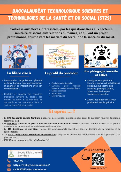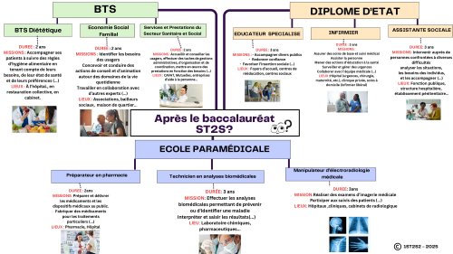 À l’issue de la classe de 2nde générale et technologique, les élèves qui s’orientent dans la voie technologique suivent un cycle d’études de deux ans (1ere et terminale) pour la préparation d’un baccalauréat technologique. Le baccalauréat ST2S s’adresse aux lycéennes et lycéens désireux de s’engager dans les secteurs sanitaire, social ou paramédical, avec une formation axée sur la compréhension du corps humain, la santé publique, et les enjeux sociaux contemporains.